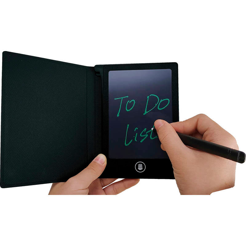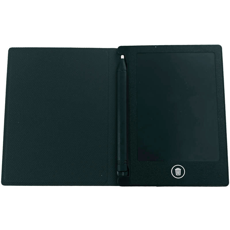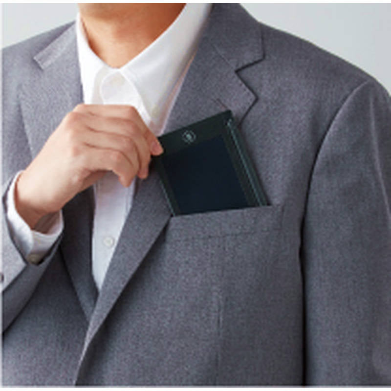 繰り返し使える電子メモパッド。キズや汚れなどを防ぐレザー調カバー付き。
